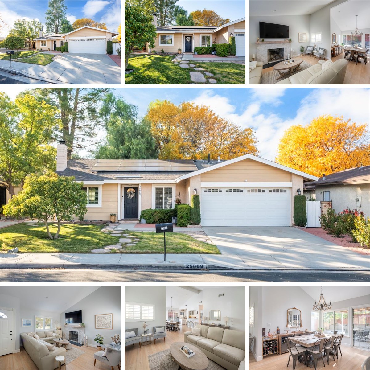 Updated single story on a cul de sac in the heart of Valencia! This 3 bedroom, 2 bath home shows light, bright and open. Enter into the living room with high ceilings, stone fireplace, newer engineered wood flooring and updated recessed lighting throughout, and neutral paint. Owners have opened up the floor plan by removing walls into the dining area and kitchen making 1 large open space perfect for entertaining and family get togethers. The kitchen with breakfast bar has white cabinets, beautiful stainless steel appliances and opens to the dining area and outside. The primary bedroom is spacious with a large window looking out to the backyard. The attached bathroom has a large walk in shower and a newer vanity and flooring. The two additional bedrooms share a hall bath with a newer vanity and flooring as well. The backyard was redone in the last 3 years with a covered patio, all new hardscape and landscape lighting. Also a two car garage with direct access. Save money with a recently installed solar power system with low monthly payments. This home is minutes from the freeway or shopping. Enjoy the Valencia paseo system that connects at the end of the cul de sac and walk to the community pool and playground just down the block. Excellent schools and no mello roos. Make this charming home yours today!